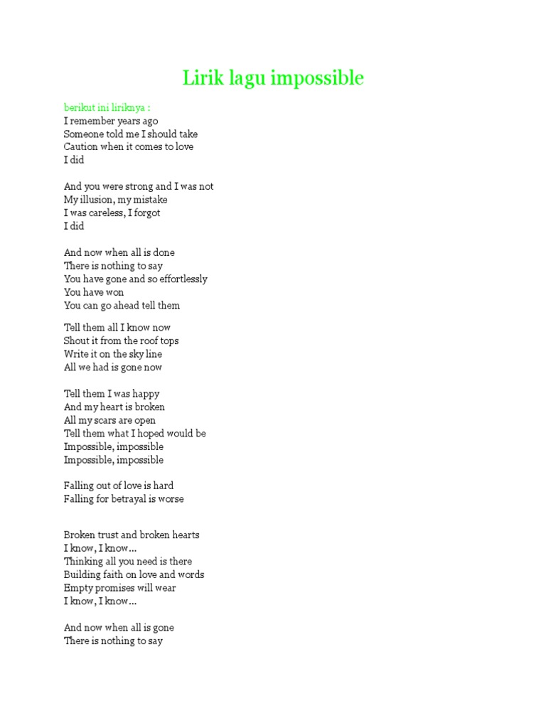Terjemahan lirik lagu impossible shontelle lirik impossible juga dinyanyikan james arthur sebagai cover. I can do anything Aku bisa lakukan apapun. STiap complaint he listened to In Jesus there is an answer He never left he Youre late in regret.